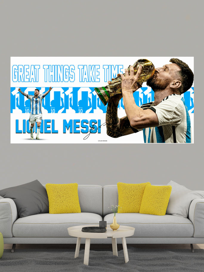 Discover the power of emotion with our "Great Things Take Time- Messi" poster, exclusively at Klaiz Designs.